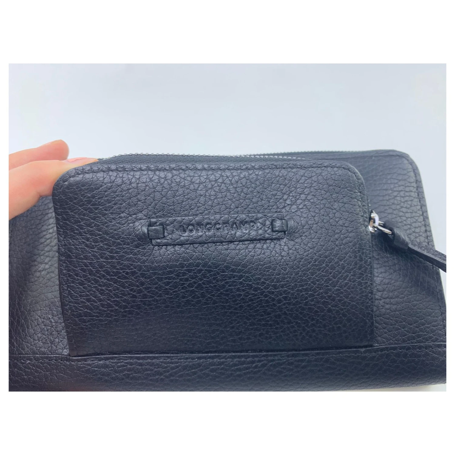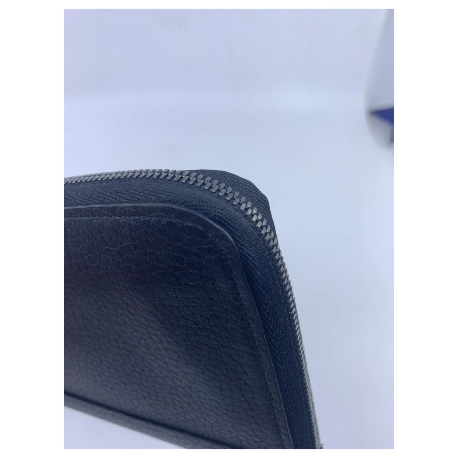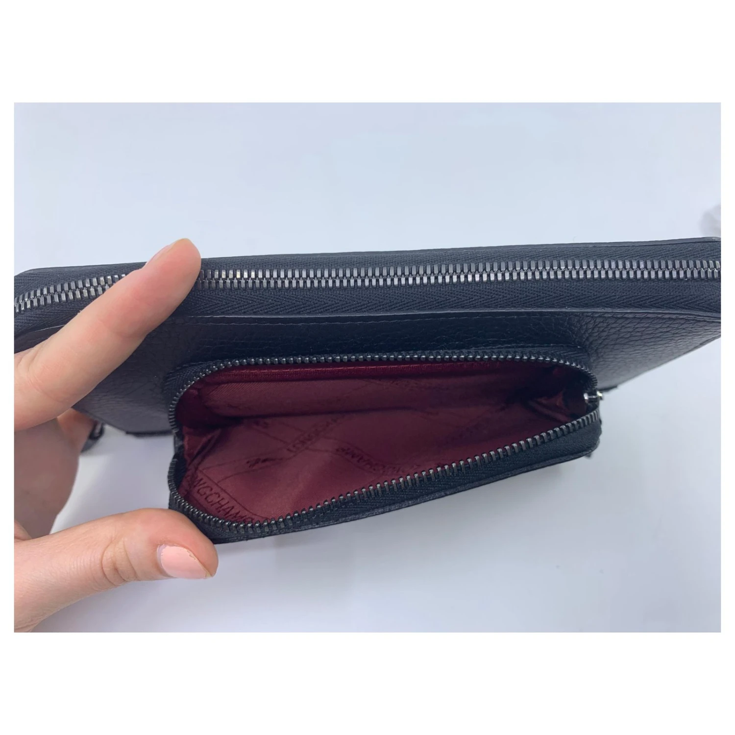 Noir en cuir grainé. Une poche avant avec zip argent. Deuxième poche avec deux compartiments avec espace monnaie et carte.
