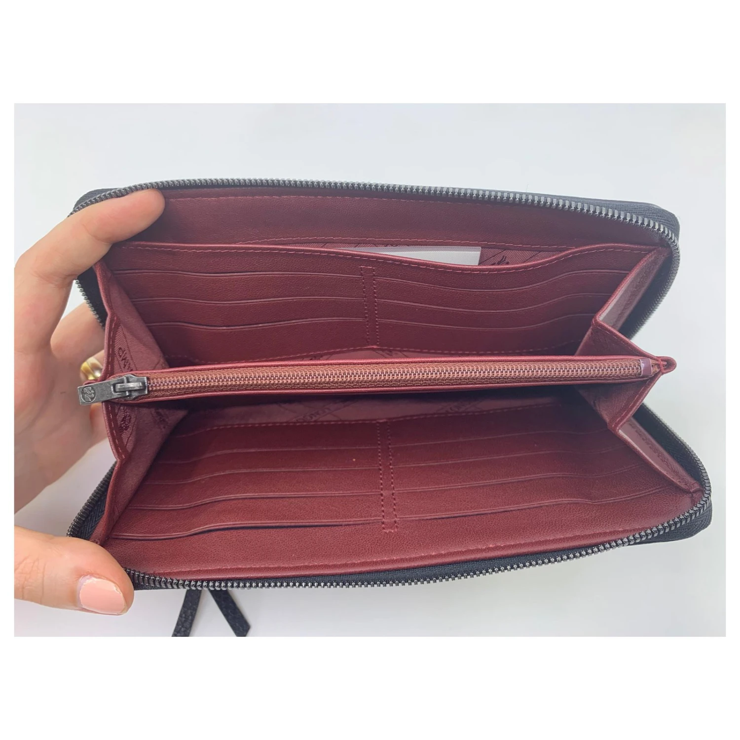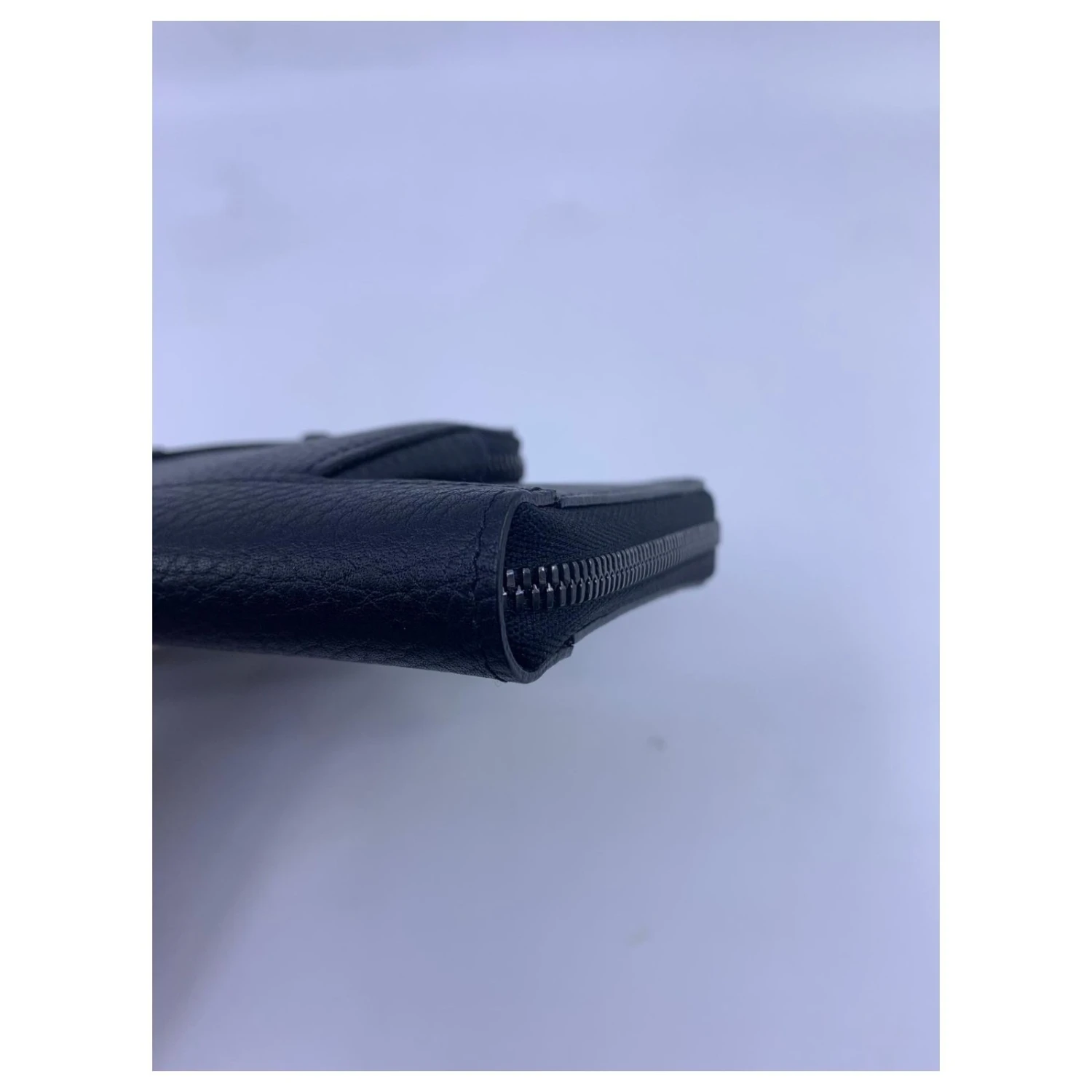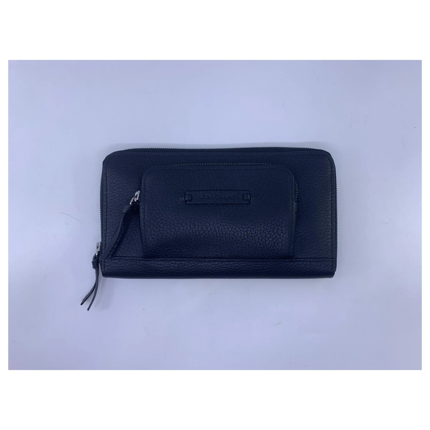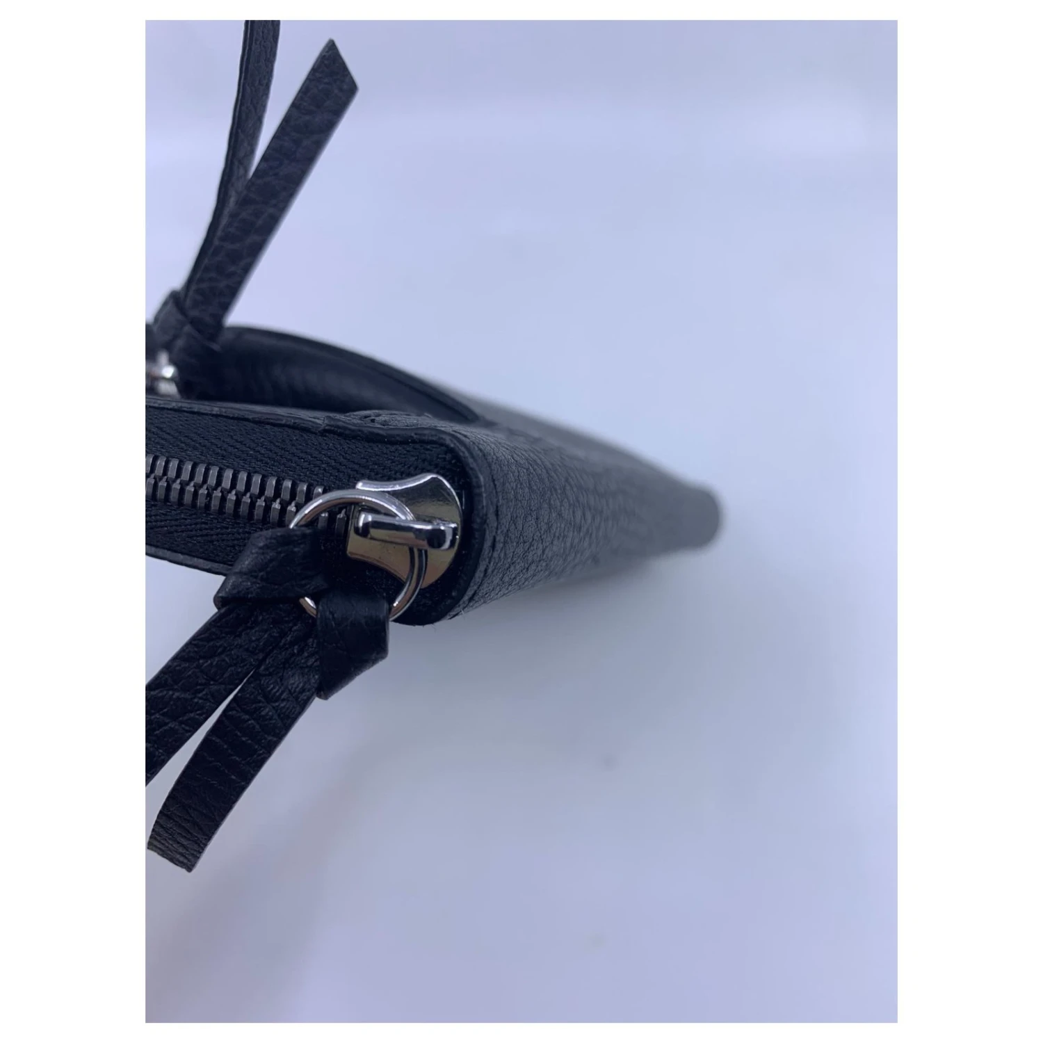 Noir en cuir grainé. Une poche avant avec zip argent. Deuxième poche avec deux compartiments avec espace monnaie et carte.