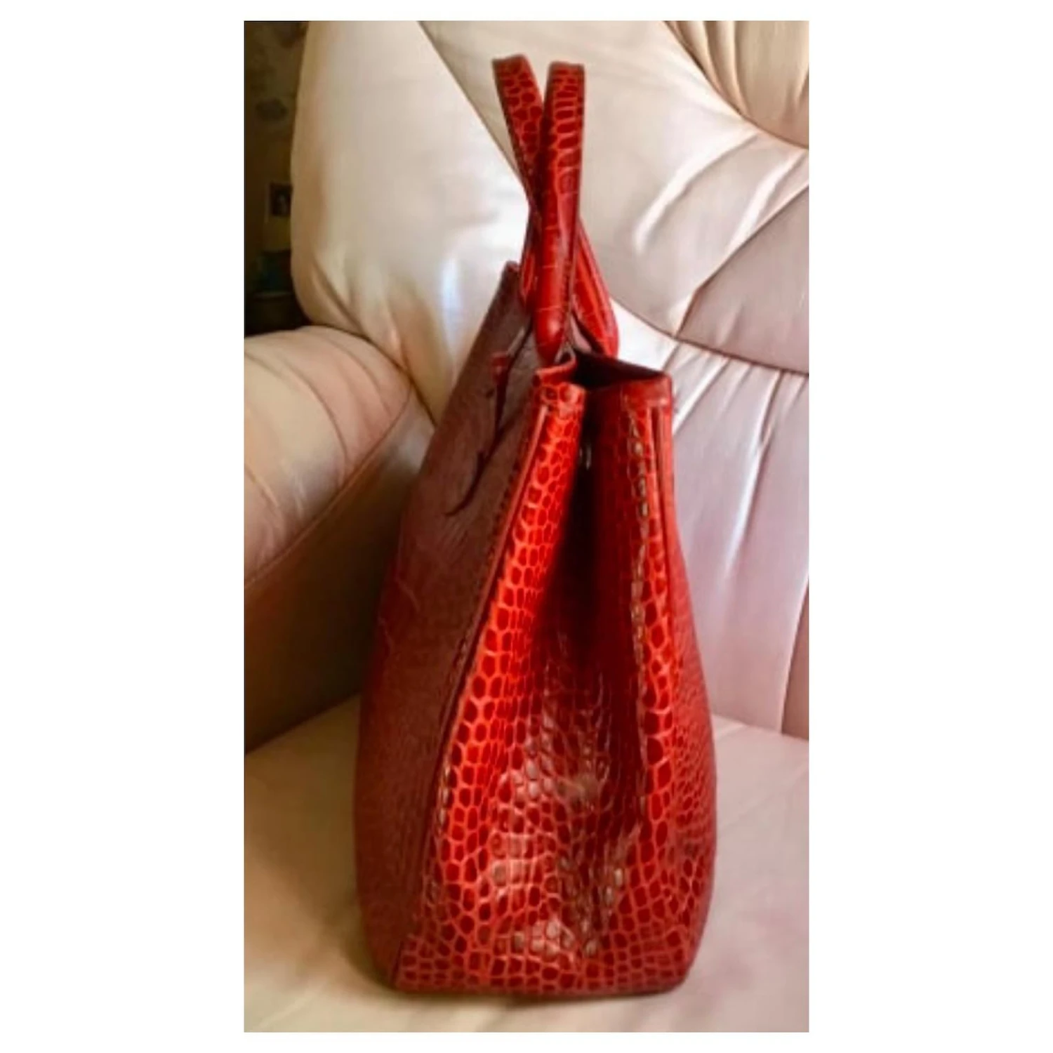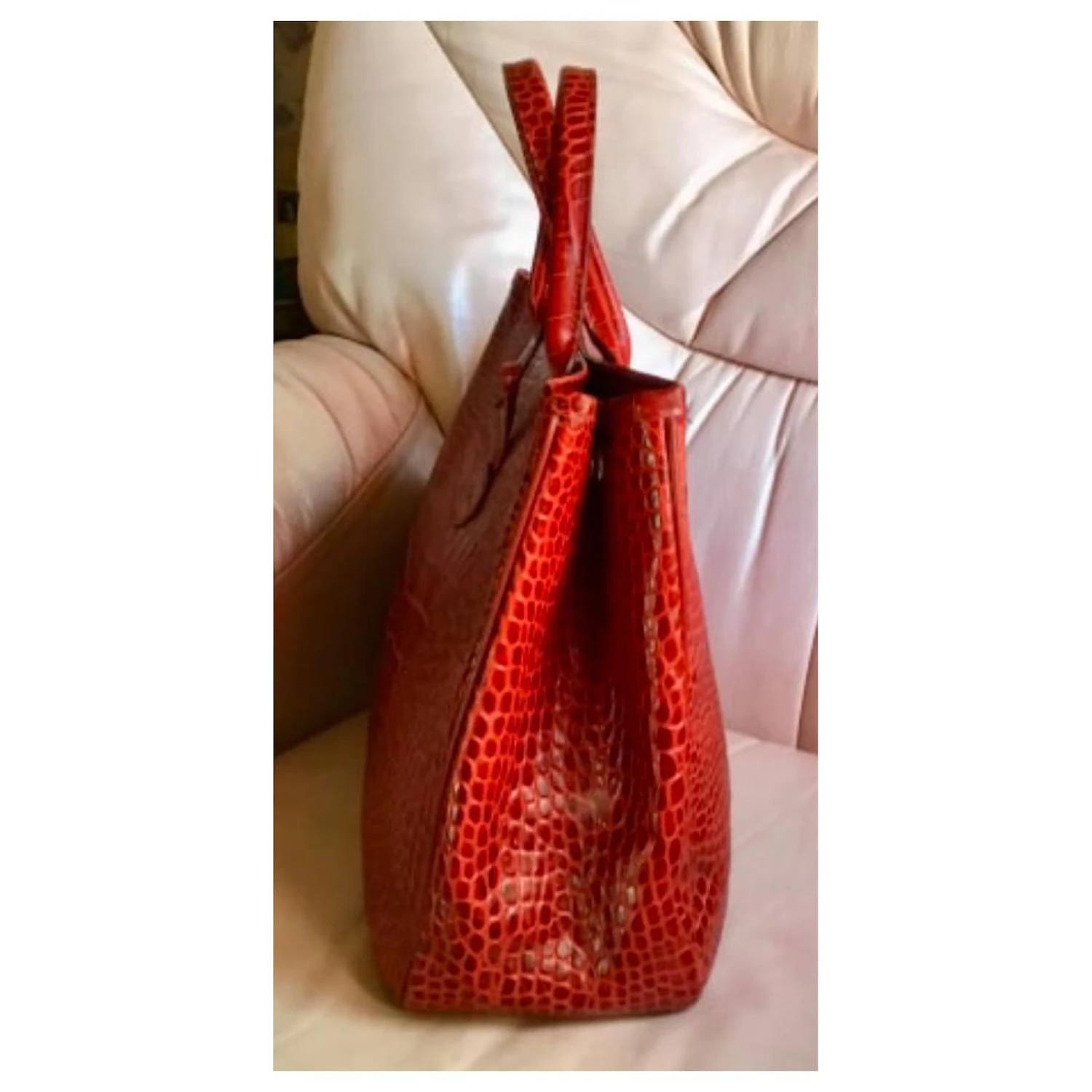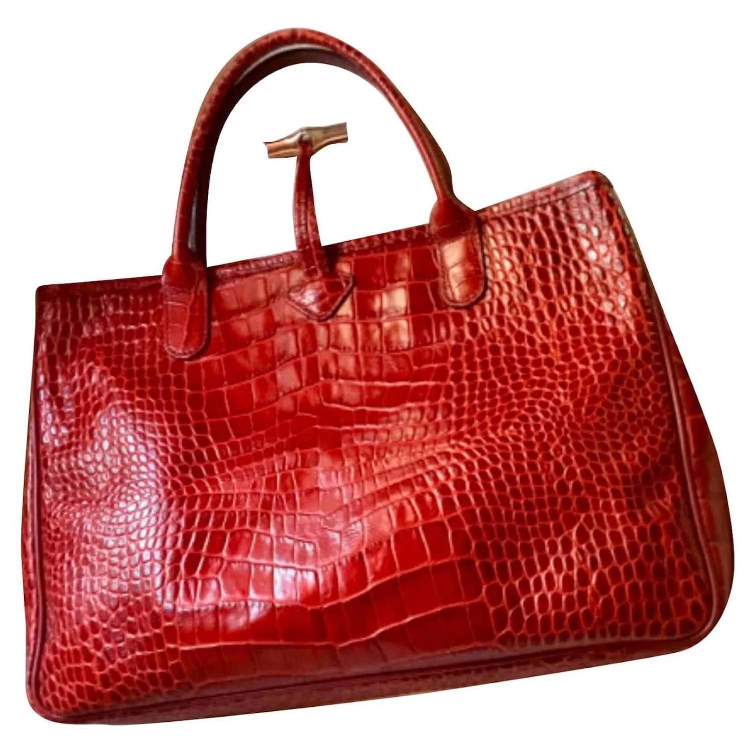 MAGNIFIQUE SAC ROUGE ÉCARLATE PORTÉ MAIN EN CUIR DE VEAU FRAPPÉ FAÇON CROCO LIGNE ROSEAU ARGENT DE CHEZ LONGCHAMP.