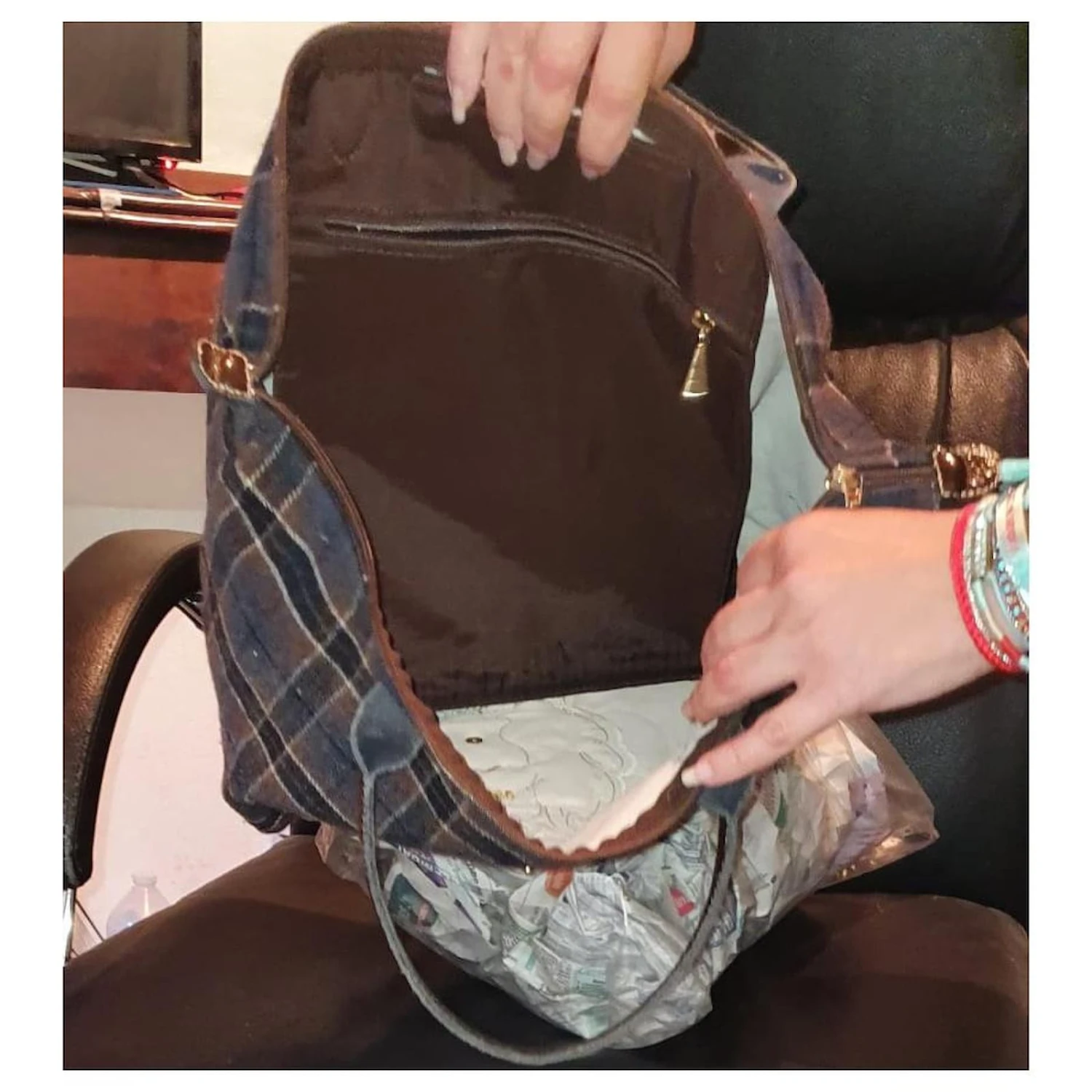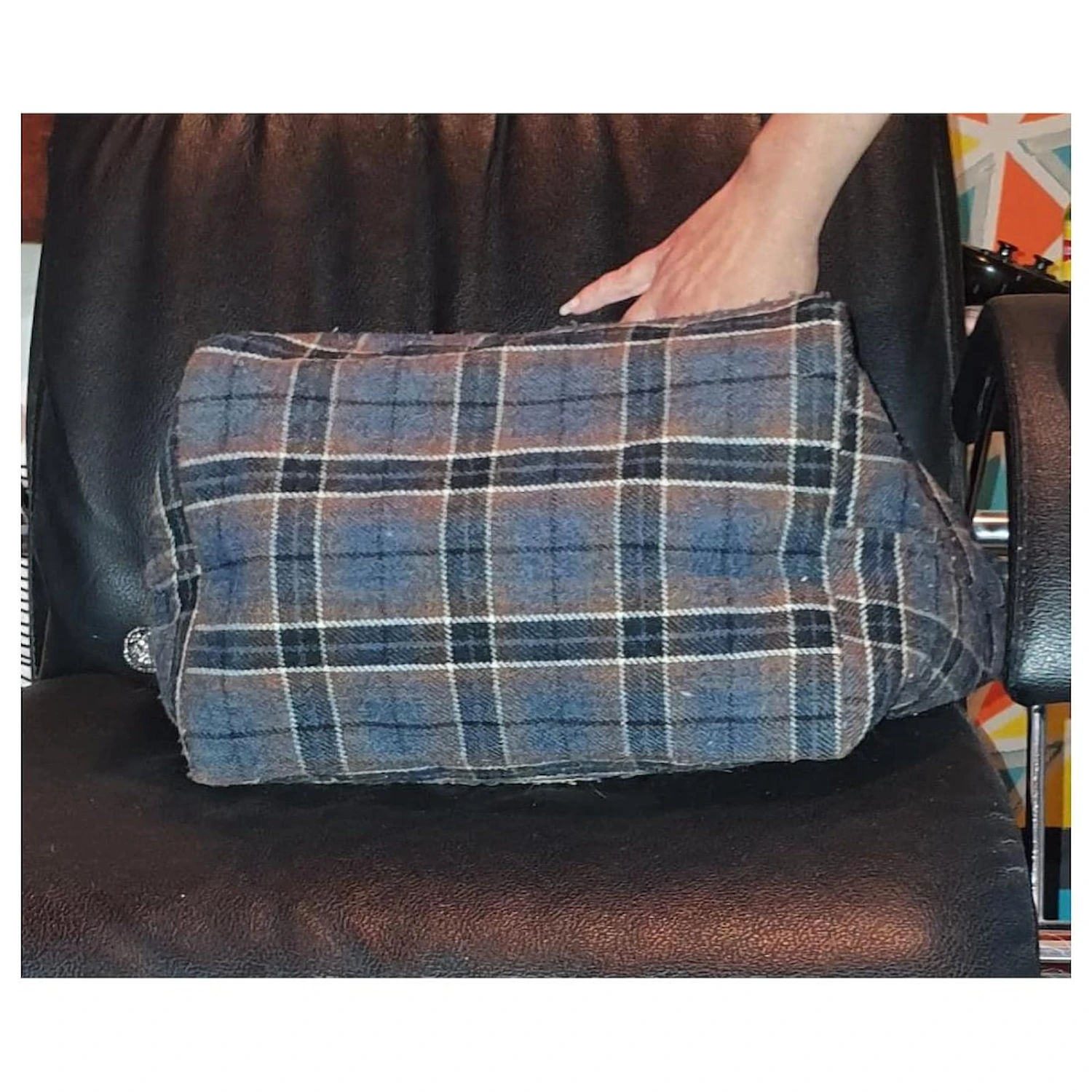 sac cabas à carreaux en laine et cuir verni marron