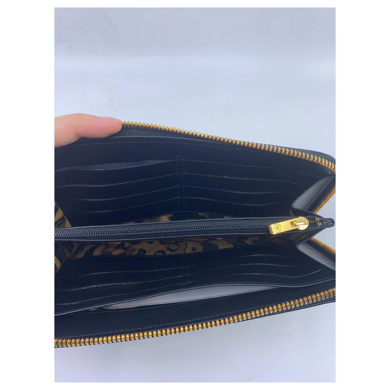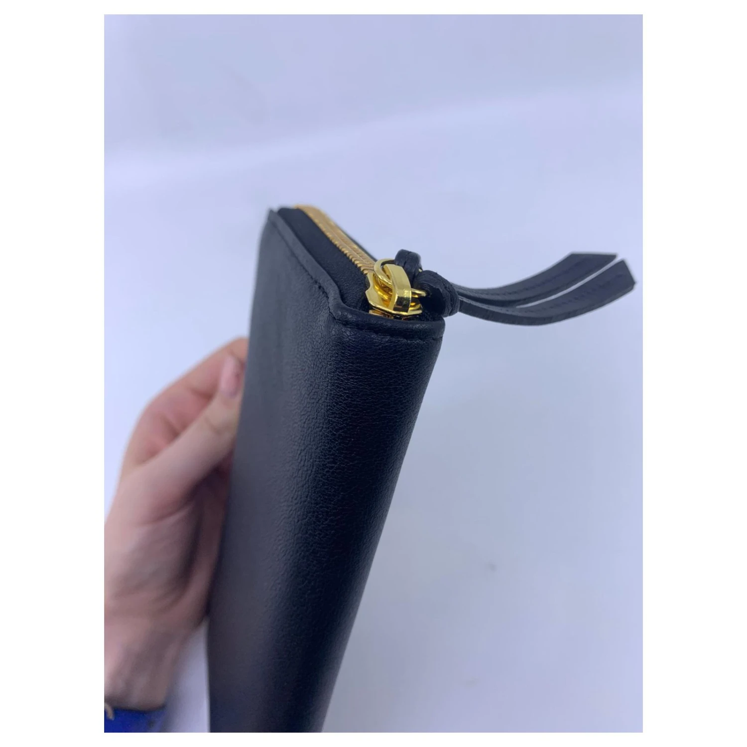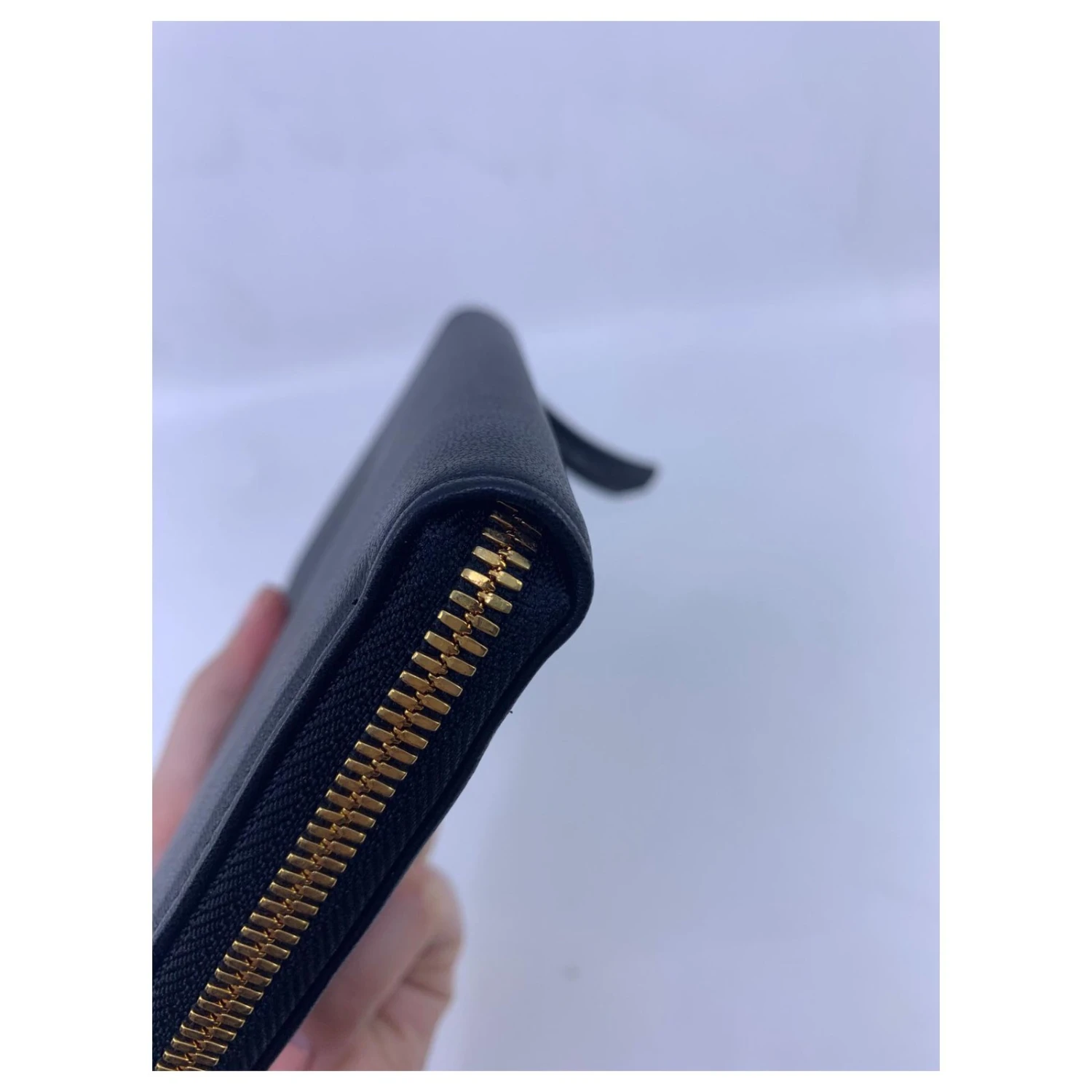 Cuir lisse noir. Fermeture zippé dorée. Deux Compartiments avec espace monnaie et cartes.