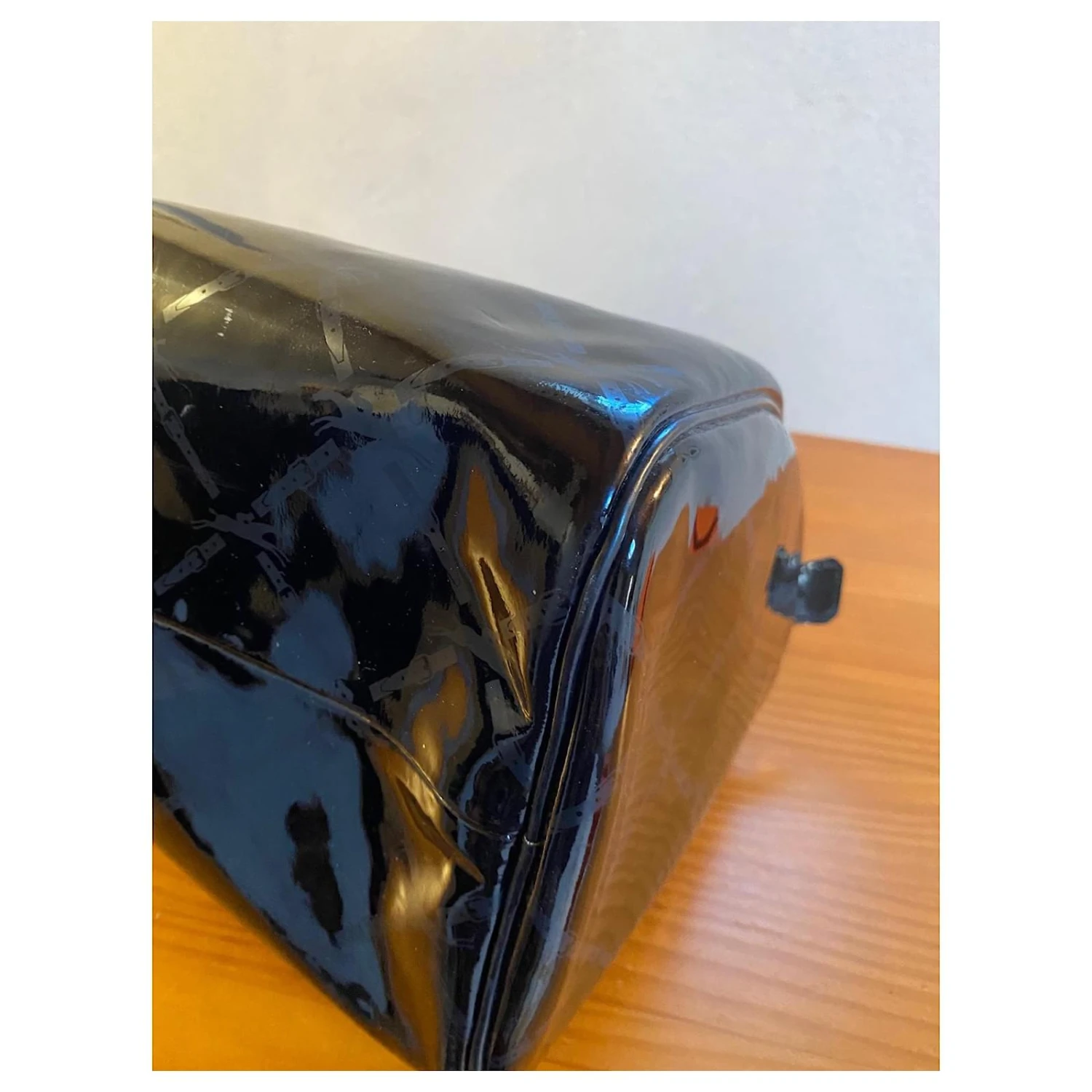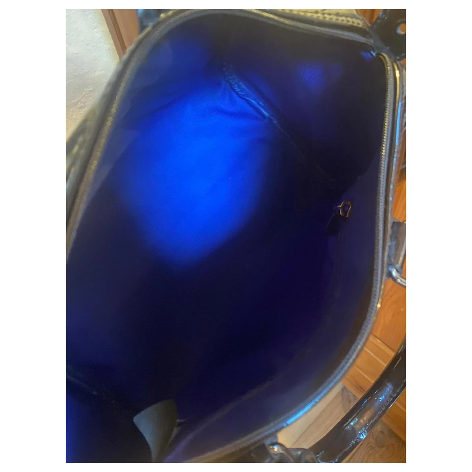 100 % cuir vernis de couleur noir, intérieur en toile épaisse bleu électrique.