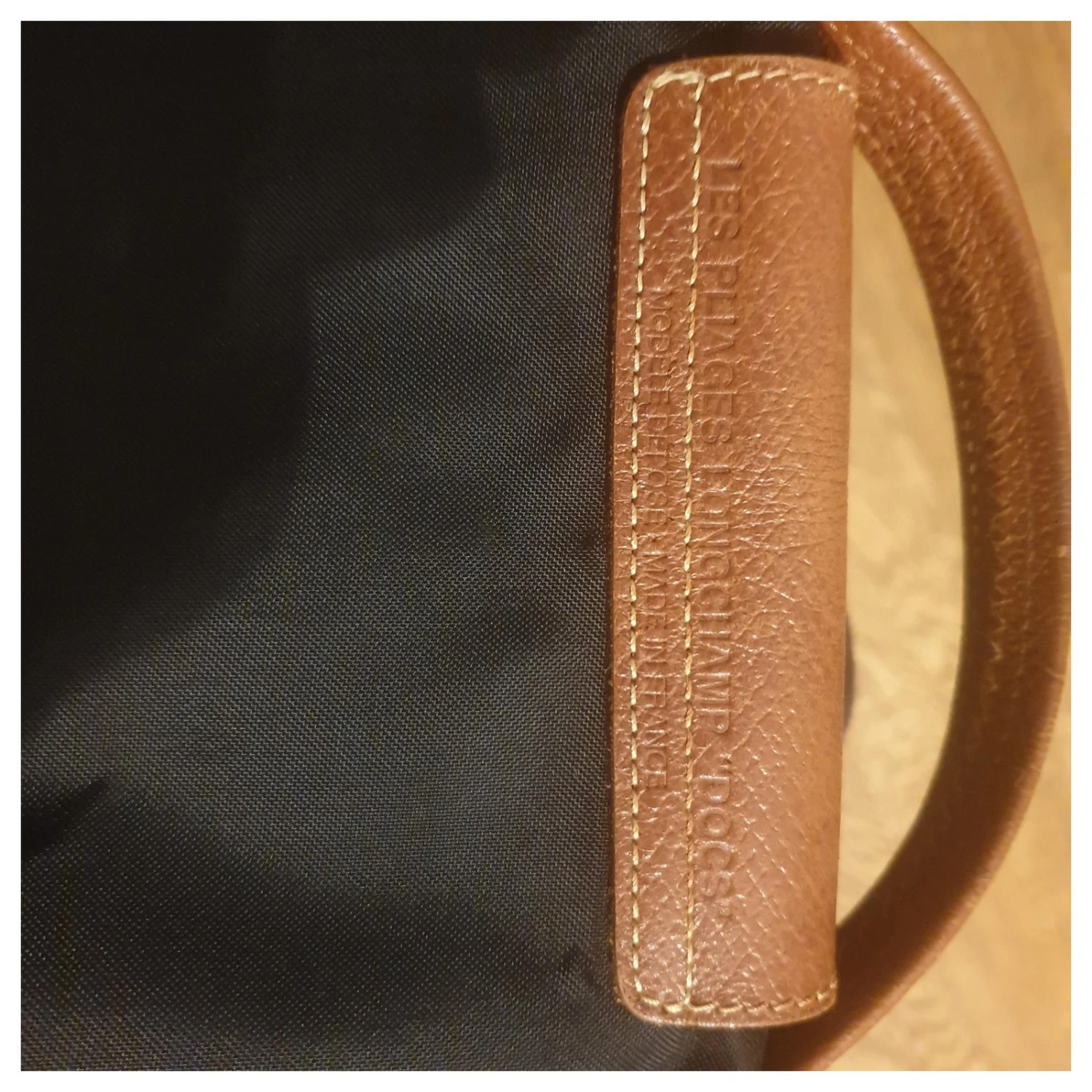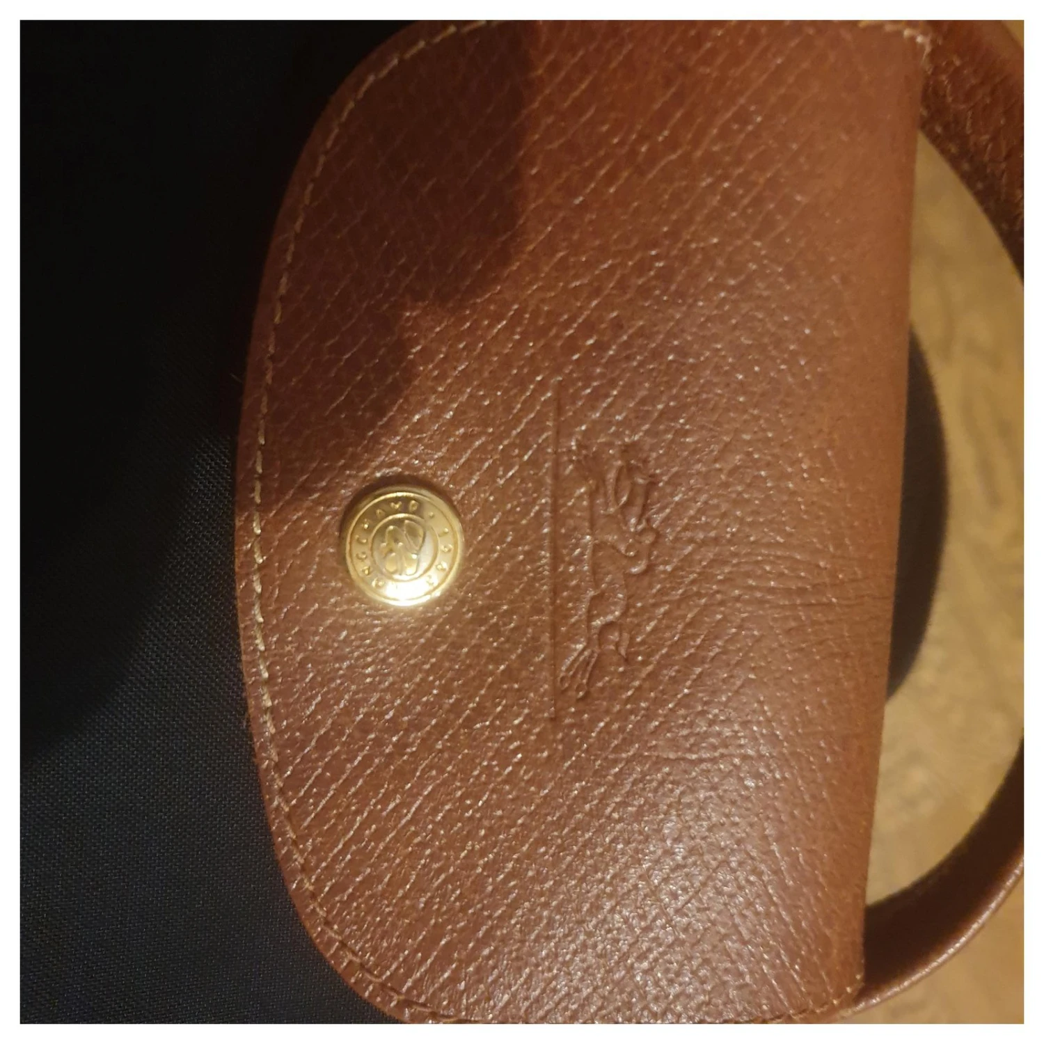 Logo Longchamp gravé à l’avant et à l’arrière du rabat en cuir